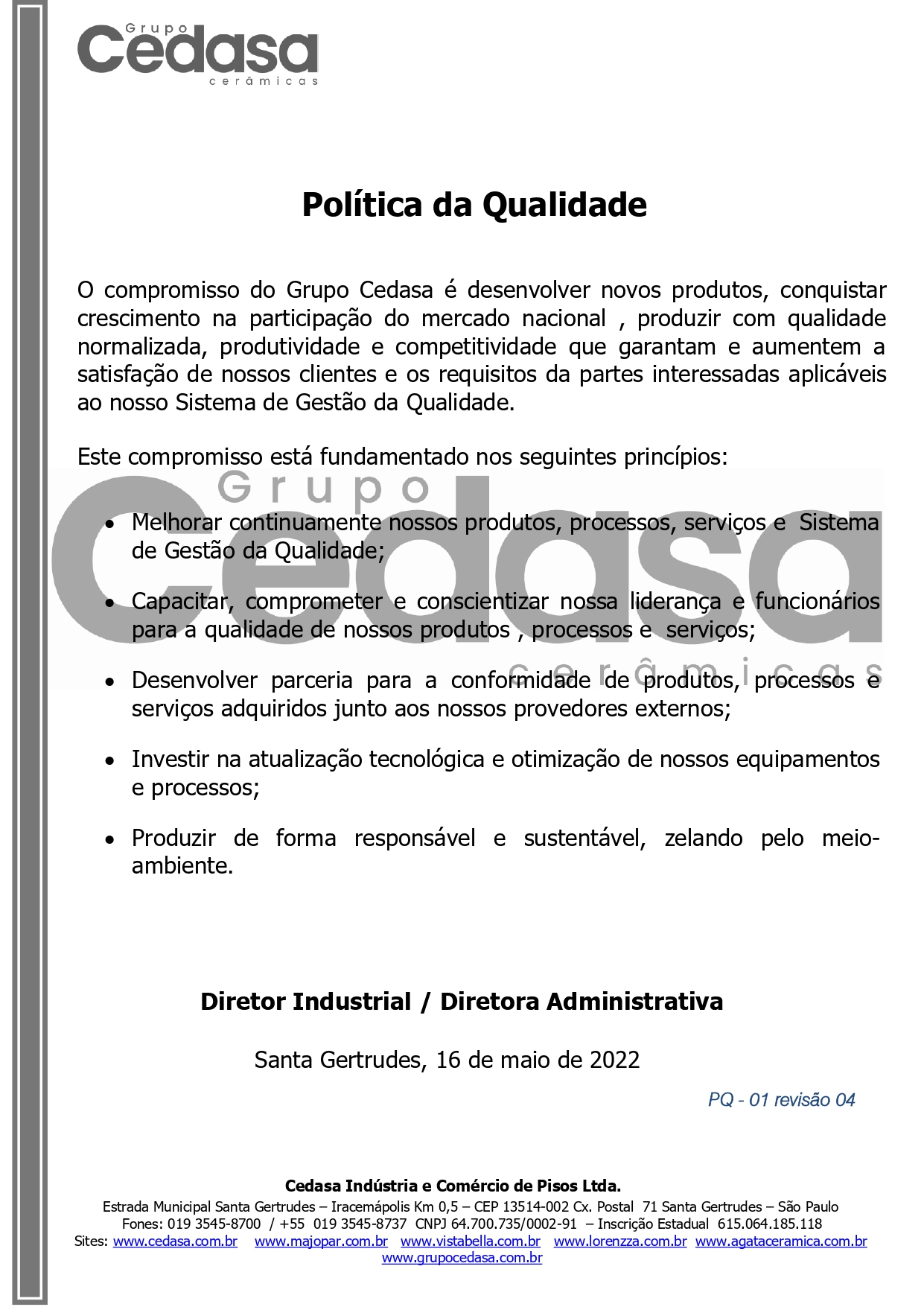 Política da qualidade do Grupo Cedasa - 2023